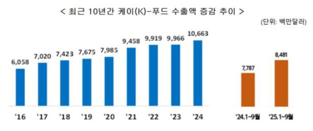 관세청이 발표한 보도자료에 따르면, 2025년 9월 기준 K-푸드 수출액은 전년 대비 8.9% 증가한 84억 8천만 달러(약 11조 8,700억 원)로 같은 기간 역대 최대 실적을 기록했다.