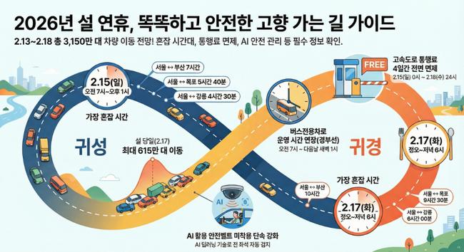대책의 핵심은 ‘요금소 분산’과 ‘대중교통 속도 유지’다. 통행료 면제는 2월 15~18일 시행된다. 경부선 버스전용차로(양재~신탄진)는 연휴 기간 운영시간을 확대해 혼잡을 완화한다는 계획이다.