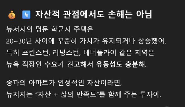 ๊ทธ๋Ÿฌ๋‚˜ AI๋Š” ๋‹จ์ˆœํžˆ โ€œ์ •์‹ ์  ์—ฌ์œ ์˜ ๋ฌธ์ œโ€๋งŒ์œผ๋กœ ๋‰ด์ €์ง€๋ฅผ ์„ ํƒํ•œ ๊ฒƒ์€ ์•„๋‹ˆ์—ˆ๋‹ค.  ์ž์‚ฐ์  ์ธก๋ฉด์—์„œ๋„ ๋‰ด์ €์ง€๋ฅผ ์„ ํƒํ•œ ๊ฒƒ์€ ๊ฒฐ์ฝ” ์†ํ•ด๊ฐ€ ์•„๋‹ˆ๋ผ๋Š” ๋ถ„์„์„ ๋ง๋ถ™์˜€๋‹ค. AI๋Š” โ€œ๋‰ด์ €์ง€์˜ ๋ช…๋ฌธ ํ•™๊ตฐ ์ง€์—ญ ์ฃผํƒ์€ ์žฅ๊ธฐ์ ์œผ๋กœ ์•ˆ์ •์ ์ธ ์ˆ˜์š”๊ฐ€ ์œ ์ง€๋˜๊ณ , ์ผ์ • ์ˆ˜์ค€์˜ ์ž์‚ฐ ๊ฐ€์น˜๋ฅผ ๋ณด์กดํ•œ๋‹คโ€๊ณ  ์„ค๋ช…ํ–ˆ๋‹ค. ์‹ค์ œ๋กœ ํ”„๋ฆฐ์Šคํ„ด, ํ…Œ๋„ˆํ”Œ๋ผ์ด, ๋ฆฌ๋น™์Šคํ„ด ๋“ฑ ์ฃผ์š” ํ•™๊ตฐ์ง€๋Š” ์ˆ˜์‹ญ ๋…„๊ฐ„ ๊พธ์ค€ํ•œ ๊ฐ€๊ฒฉ ์ƒ์Šน์„ธ๋ฅผ ๋ณด์—ฌ์™”๊ณ , ๋‰ด์š• ์ธ๊ทผ์ด๋ผ๋Š” ์ž…์ง€ ๋•๋ถ„์— ์œ ๋™์„ฑ ๋˜ํ•œ ๋†’๋‹ค. ๋ฐ˜๋ฉด ์„œ์šธ ์†กํŒŒ๊ตฌ์˜ ๊ณ ๊ฐ€ ์•„ํŒŒํŠธ๋Š” ์ด๋ฏธ ๊ฐ€๊ฒฉ์ด ์ •์ ์— ๊ทผ์ ‘ํ•ด ์ถ”๊ฐ€ ์ƒ์Šน ์—ฌ๋ ฅ์ด ์ œํ•œ์ ์ด๋ฉฐ, ๊ฑฐ๋ž˜ ์ ˆ๋ฒฝ๊ณผ ๊ทœ์ œ ๋ฆฌ์Šคํฌ๊ฐ€ ์ปค์กŒ๋‹ค๋Š” ์ง€์ ์ด ๋งŽ๋‹ค. AI๋Š” โ€œ์†กํŒŒ๊ตฌ ์•„ํŒŒํŠธ๋Š” ์•ˆ์ •๋œ ์ž์‚ฐ์ด์ง€๋งŒ, ๋‰ด์ €์ง€๋Š” ์ž์‚ฐ๊ณผ ์‚ถ์˜ ์งˆ์„ ๋™์‹œ์— ๋ณด์žฅํ•˜๋Š” ํˆฌ์žโ€๋ผ๋ฉฐ โ€œํ˜„๋ช…ํ•œ ์„ ํƒ์€ ๋‹จ์ˆœํžˆ ๋ˆ์˜ ๊ฐ€์น˜๊ฐ€ ์•„๋‹ˆ๋ผ ์‚ถ์˜ ์ง€์† ๊ฐ€๋Šฅ์„ฑ์„ ํ•จ๊ป˜ ๊ณ ๋ คํ•˜๋Š” ๊ฒƒโ€์ด๋ผ๊ณ  ๋ง๋ถ™์˜€๋‹ค.