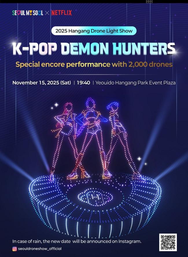 K-pop Demon Hunters Drone Light Show(Photo credit: Seoul Metropolitan government) The “Han River Drone Light Show”, which illuminated the night sky of Seoul, will hold its final performance of the year on Saturday, November 15 at 7:40 p.m. at Yeouido Hangang Park, featuring the theme “K-POP Demon Hunters”