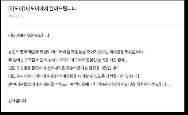 On November 12, 2025, ADOR released an official statement confirming the return of Haerin and Hyein: