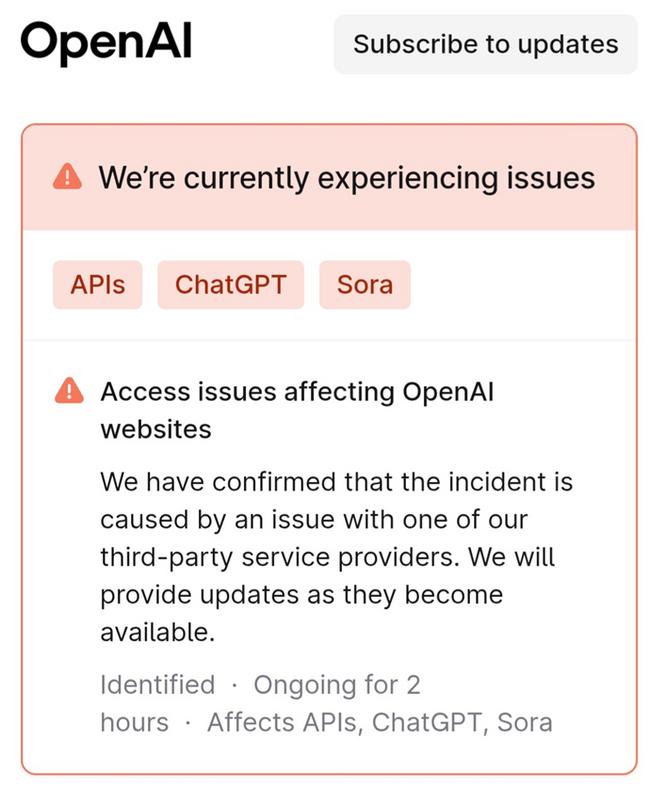 OpenAI는 공식 상태 페이지에서 “서드파티 서비스 제공자의 문제로 인해 ChatGPT, Sora, API 등 대부분 서비스에서 간헐적 접속 장애가 발생하고 있다”고 밝혔다. 해당 서드파티가 클라우드플레어임이 곧 확인됐다.
