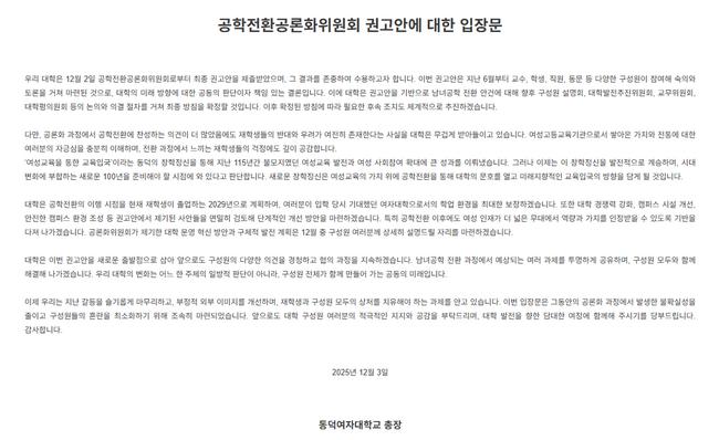 동덕여대 홈페이지에 올라온 공학전환 결정에 대한 입장문