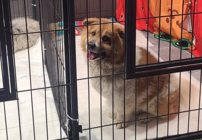 보호소에서 사람을 보며 웃고 있는 부상당한 강아지 = X 캡쳐