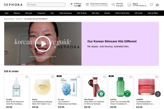 세포라 홈페이지에 Korean Skincare 전용 페이지가 있을 만큼 K-뷰티는 상당히 인기이다. (사진: 세포라 쇼핑몰)