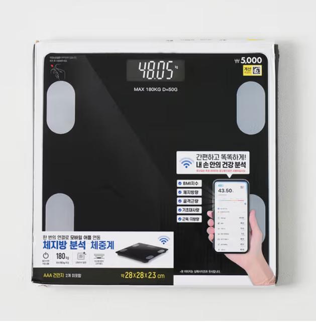 그 중에서도 단연 화제는 5천 원짜리 체지방 측정 체중계다. 체중뿐 아니라 체지방, 근육량, 기초대사량까지 분석해준다니, 가격이 믿기지 않을 정도다. 실제로 이 제품은 출시 이후 꾸준한 인기를 끌고 있다.