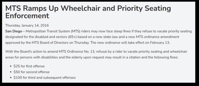 샌디에이고 대중교통(MTS) 홈페이지에 명시된 교통약자(우선석) 위반 벌금에 대한 안내: 교통약자가 탔을 때 그 좌석을 양보하지 않으면 첫 번째 위반 시에는 $25, 두 번째 위반 시에는 $50, 세 번 이상 위반 시에는 $100을 부과한다. (https://www.sdmts.com/inside-mts/media-center/news-releases/mts-ramps-wheelchair-and-priority-seating-enforcement)
